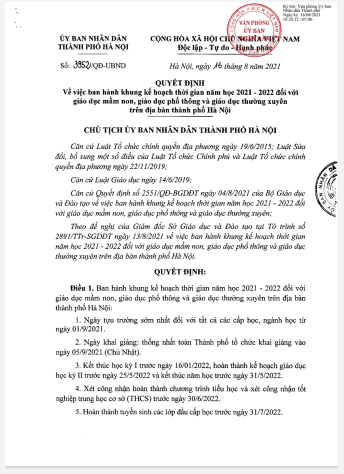 Trường Mầm non Kiến Hưng trân trọng thông báo tới quý phụ huynh quyết định số 3952/QĐ-UBND của UBND thành phố Hà Nội về việc ban hành khung kế hoạch thời gian năm học 2021-2022 đối với giáo dục mầm non, giáo dục phổ thông và giáo dục thường xuyên trên địa bàn thành phố Hà Nội.