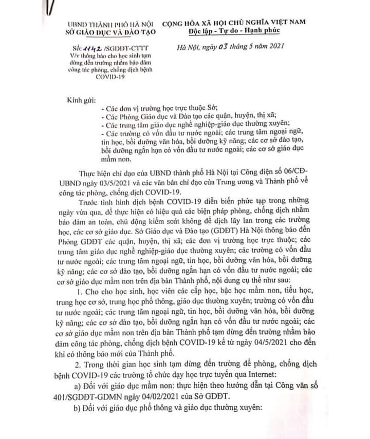 Thực hiện công văn số 1142 của Sở GD&ĐT TP Hà Nội ngày 3/5/2021, trường Mầm non Kiến Hưng trân trọng thông báo tới quý phụ huynh cho các con tạm dừng đến trường nhằm đảm bảo công tác phòng, chống dịch Covid-19 kể từ ngày 4/5/2021 cho đến khi có thông báo mới của Thành phố.