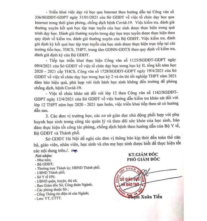 Trong thời gian học sinh tạm dừng đến trường để phòng, chống dịch Covid-19, đề nghị quý phụ huynh quản lý tốt con tại nhà và theo dõi sưc khỏe của học sinh, bảo đảm thực hiện tốt công tác phòng, chống dịch bệnh theo hướng dẫn của Bộ Y tế, Bộ GDĐT và Thành phố.