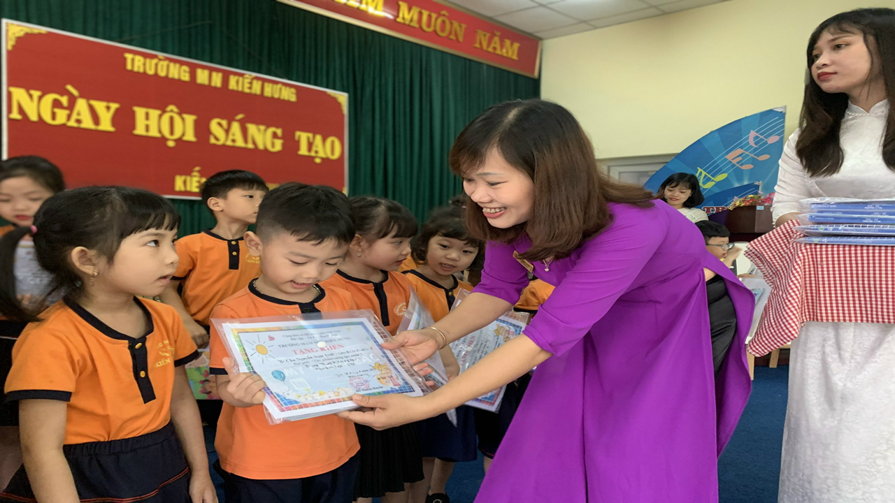 Cô hiệu trưởng: Đỗ Thanh Huyền trao giải thưởng cho các bé trong ngày hội sáng tạo