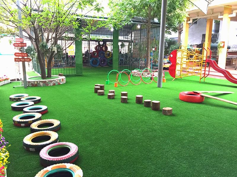 Sân chơi rộng trên 1.500m2 tạo cơ hội cho trẻ được thỏa sức vui chơi vận động, không gian sân trường thoáng mát rộng rãi với đầy đủ đồ chơi phong phú hiện đại. Đặc biệt nhà trường luôn luôn chú trọng đến phát triển thể lực cho trẻ “Khỏe mạnh về thể chất, vui vẻ về tinh thần”. Chính vì vậy nhà trường đã thiết kế nhà thể chất ở dưới sân gần với khu vui chơi ngoài trời, rất thuận tiện cho giáo viên tổ chức các hoạt động thể chất vừa có không gian rộng rãi, vừa được vận động sảng khoái, hít thở không khí trong lành ngoài trời.