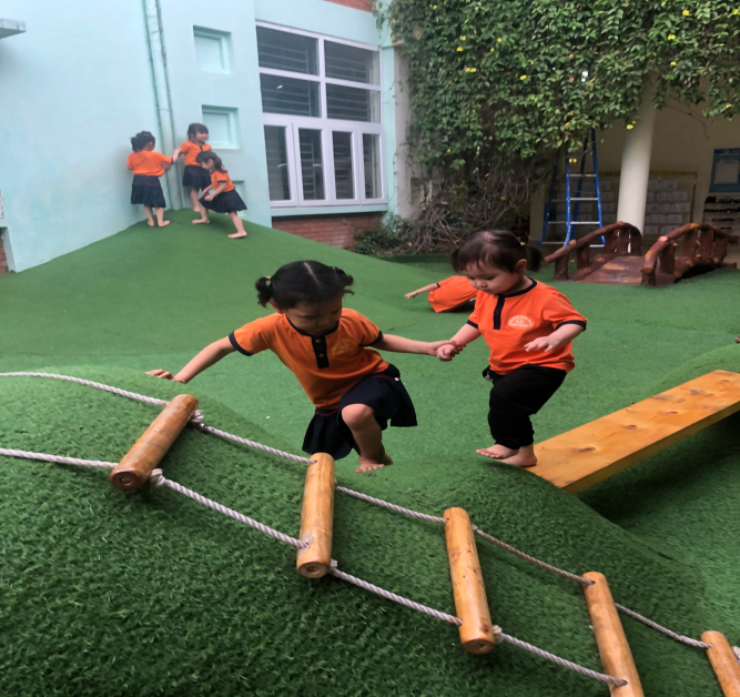 Khu “đồi cỏ” cũng là lựa chọn mà trẻ vô cùng thích thú, trẻ được leo trèo, chạy nhảy, trượt đồi cỏ, trẻ được đi thăng bằng trên cầu, được thư giãn sau các hoạt động trên lớp.